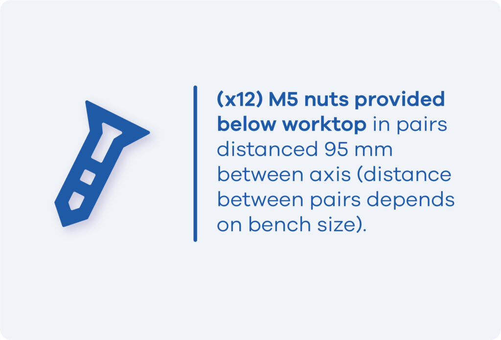 - Main frame fully welded steel, epoxy coated 9010 (check other options) with M5 nuts below worktop for accesories and attachments.