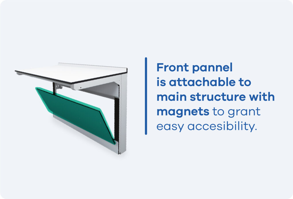 - Panelling on demand (HPL, melamine, metal sheet). Fixed panelling bolted to main structure. Accesible panelling magnet attached to main structure.
