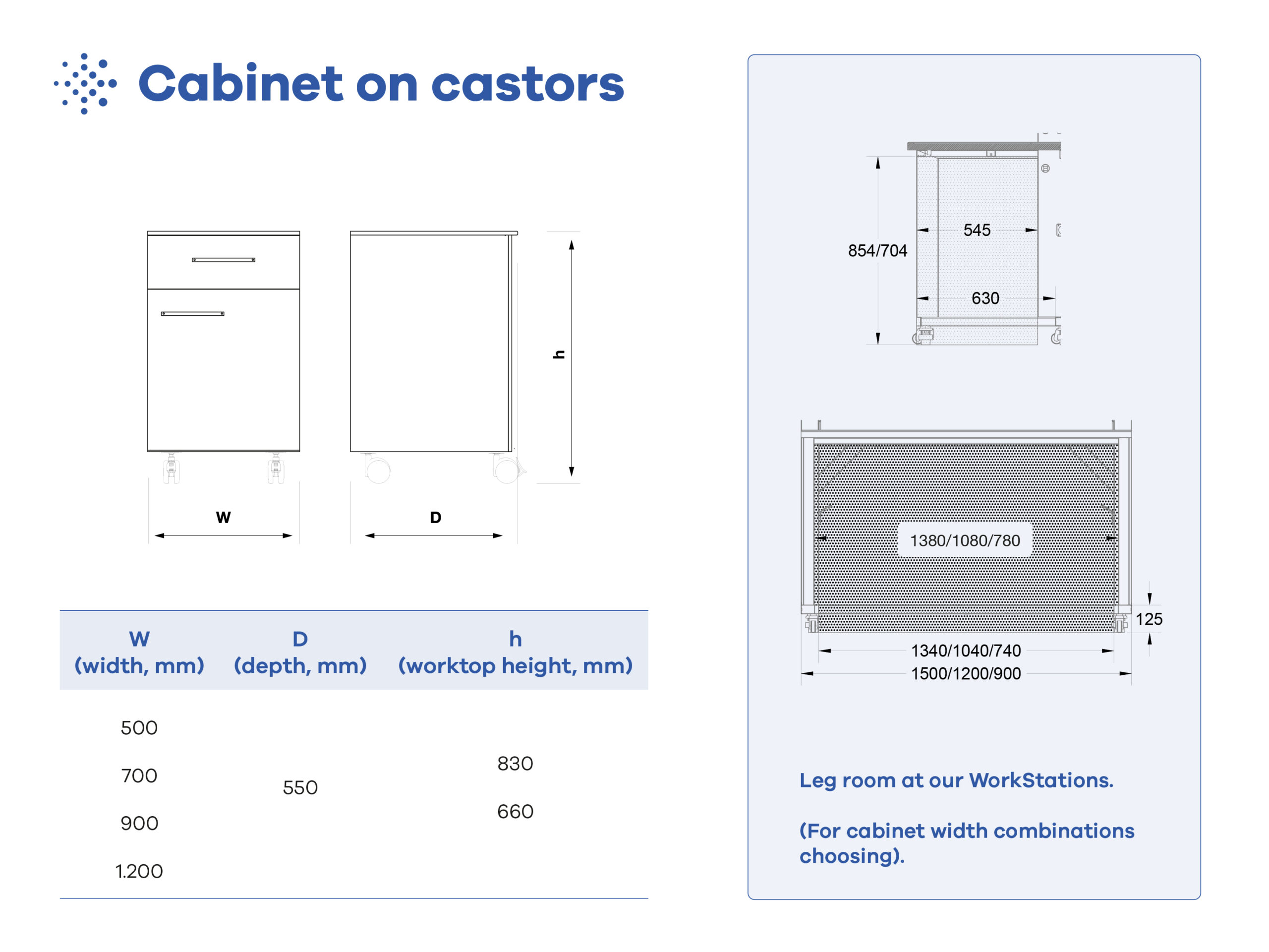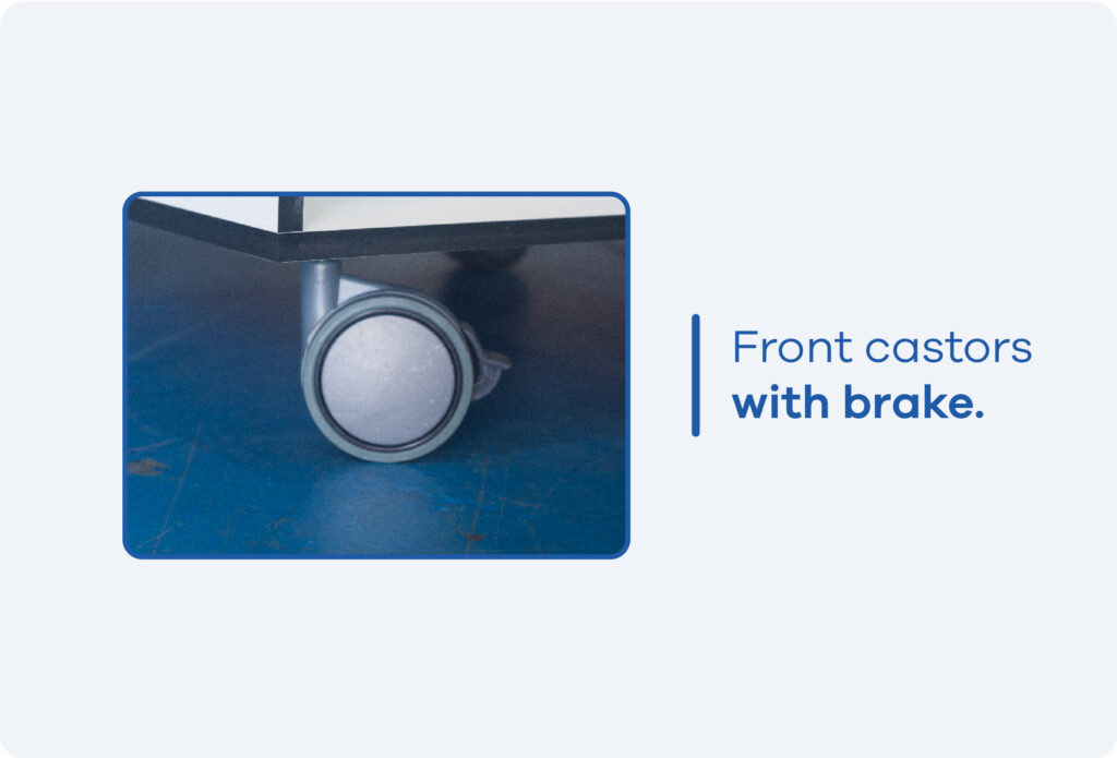 - Rubber wrapped plastic core castors, 2 without brakes at back, 2 with brakes at front.
