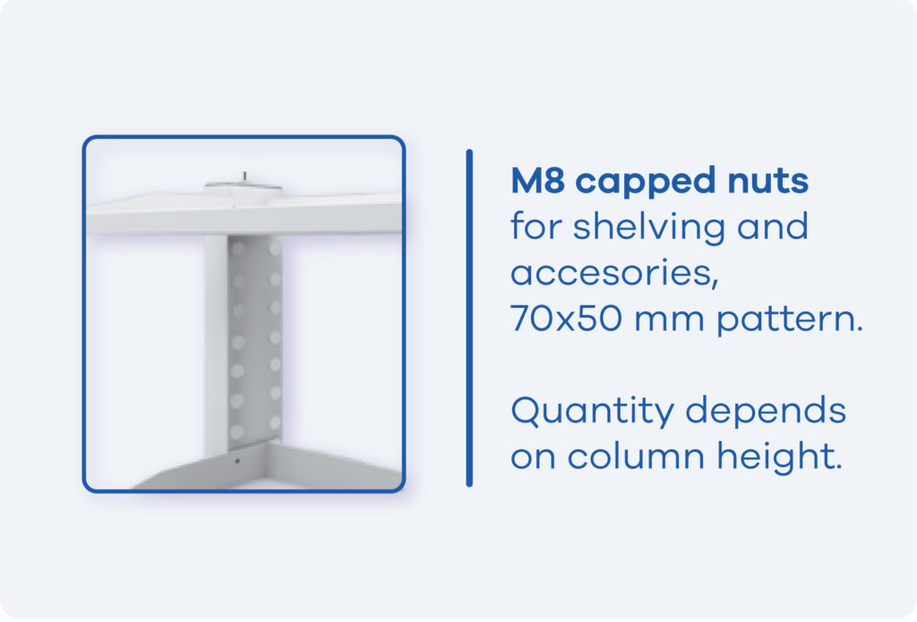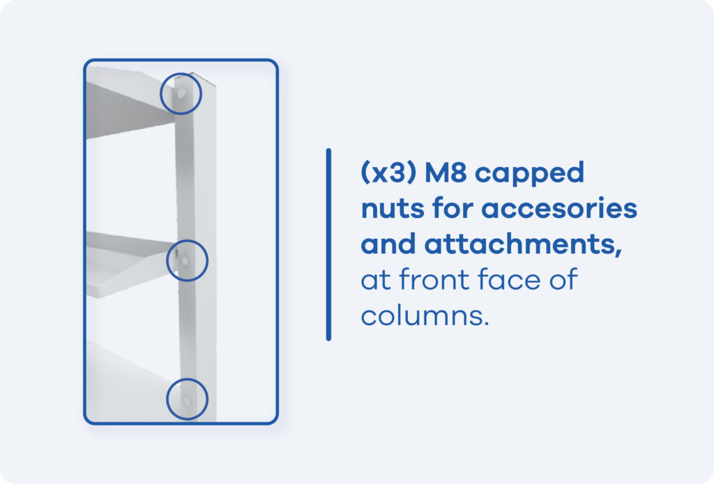 - Columns manufactured in steel tube bolted to main frame, epoxy coated 9010 (check other options), with M8 nuts at internal faces for accesories. Nuts in front faces as an option.