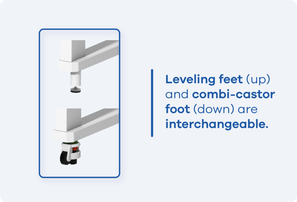 - Feet, articulated with rubber base, interchangeable with combi castor-foot.