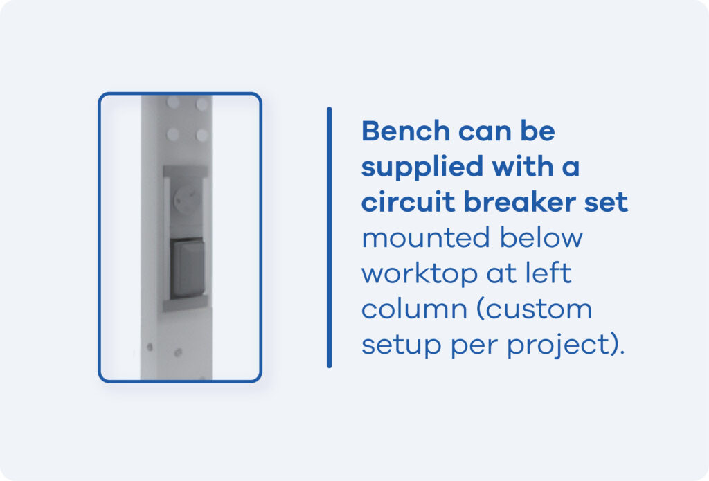 - Electrical setup 8 power sockets installed (3 each side above worktop, 1 each side below worktop). Circuit breaker setup on demand.