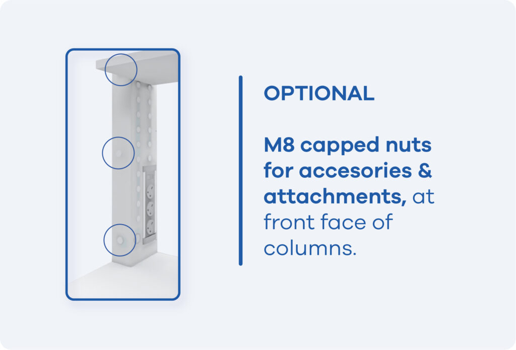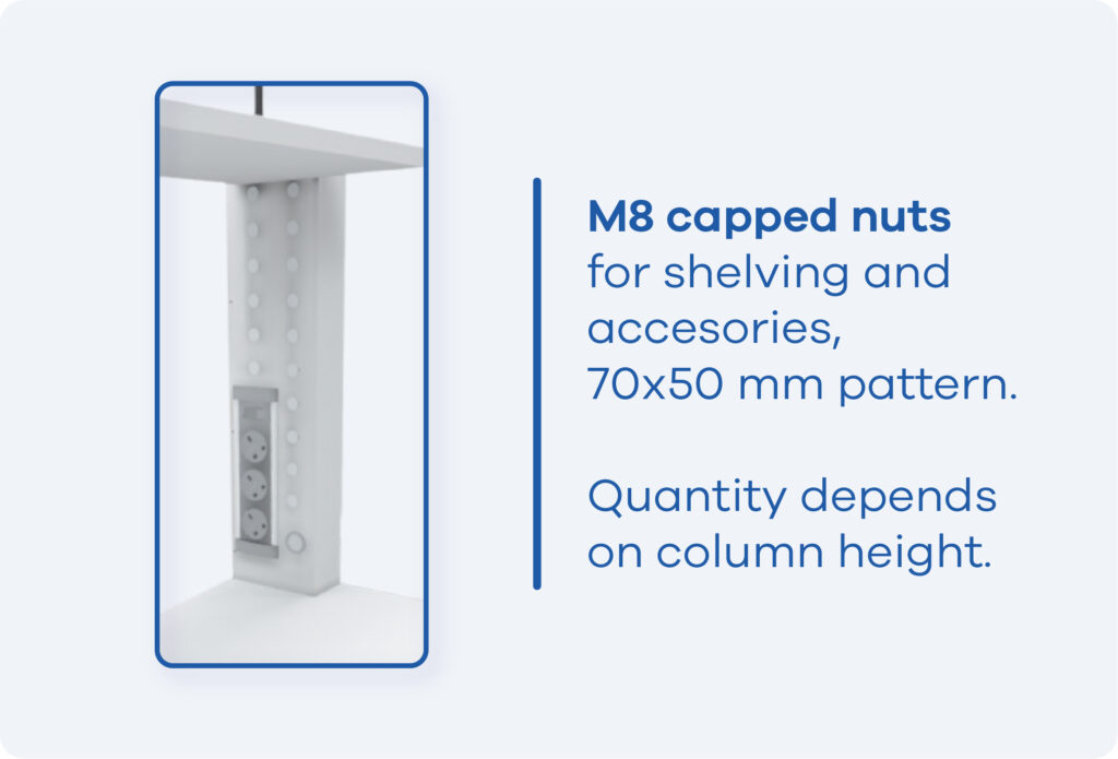 - Columns manufactured from metal sheet, magnetic covers, all joints rubber-sealed. Top covers removable allows for different combinations. Epoxy coated 9010 (check other options) with M8 nuts at internal faces for accesories. Nuts in front faces as an option.