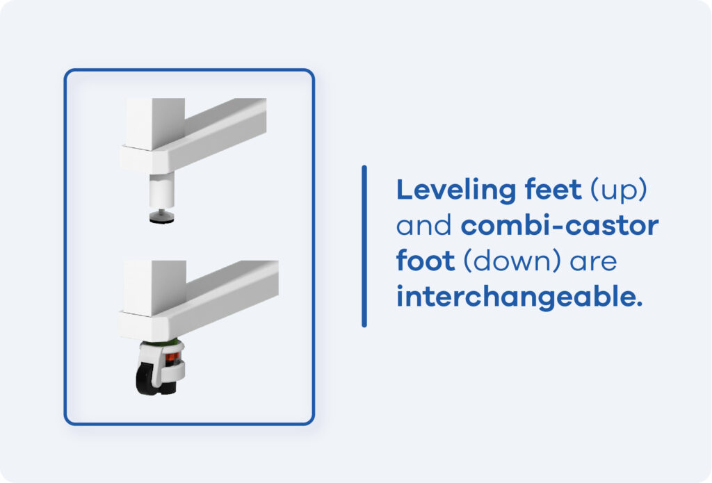 - Feet, articulated with rubber base, interchangeable with combi castor-foot.