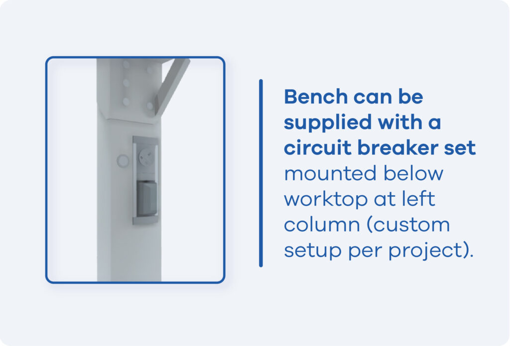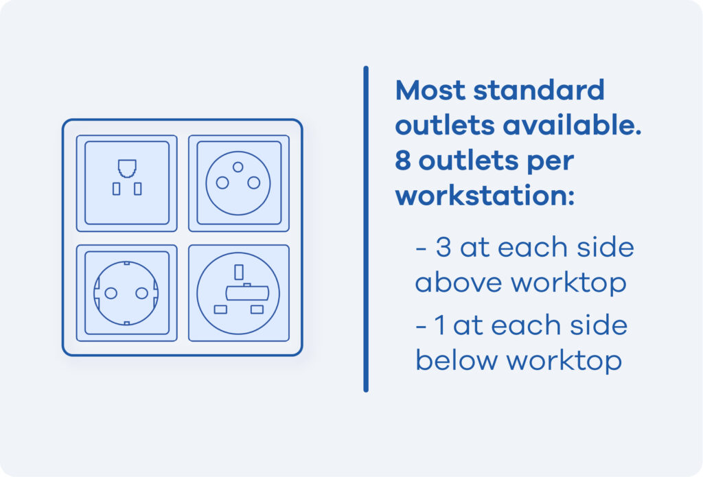 - Electrical setup 8 power sockets installed (3 each side above worktop, 1 each side below worktop). Circuit breaker setup on demand.