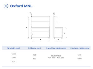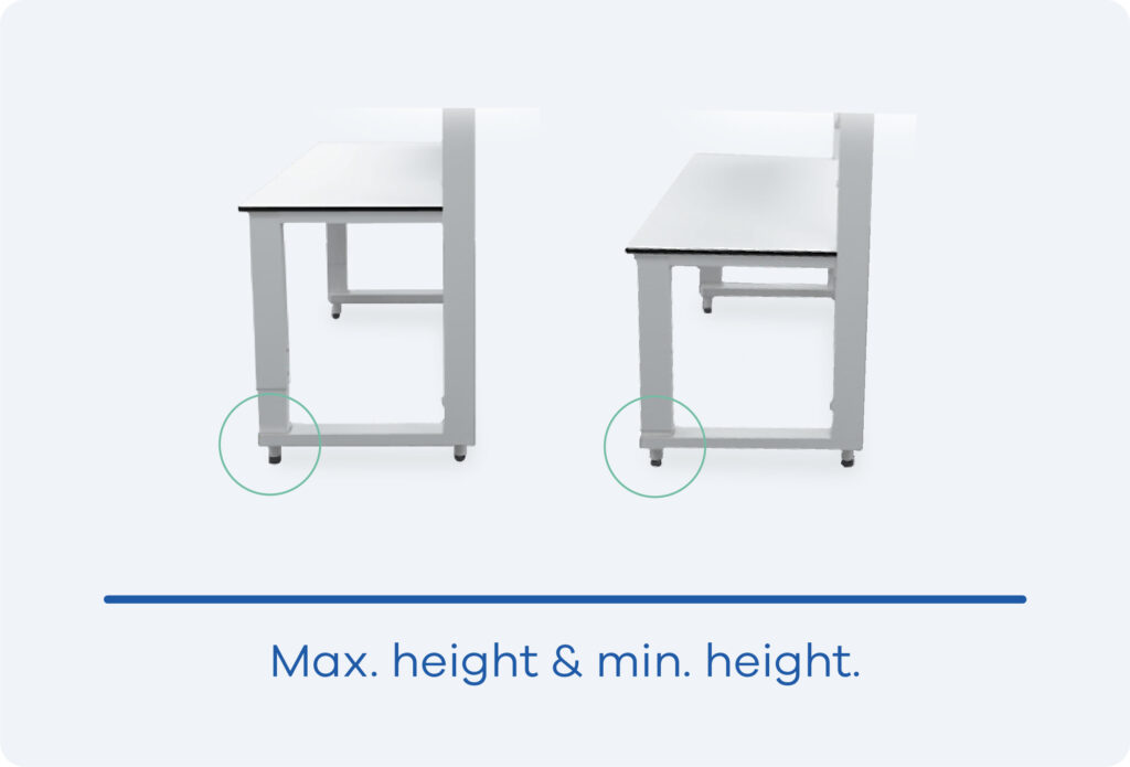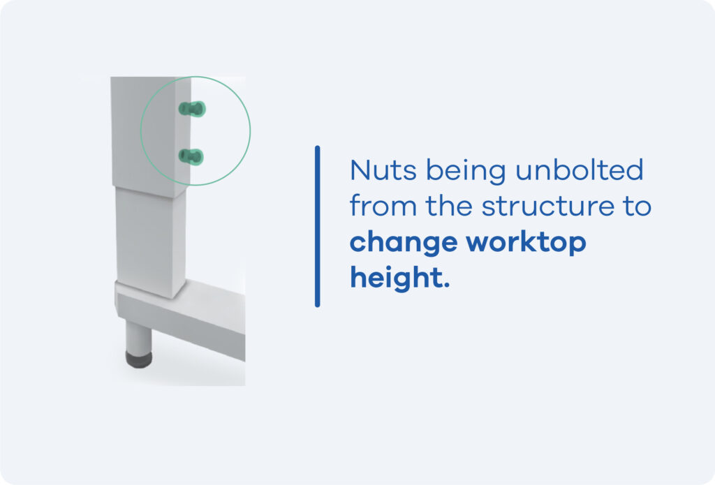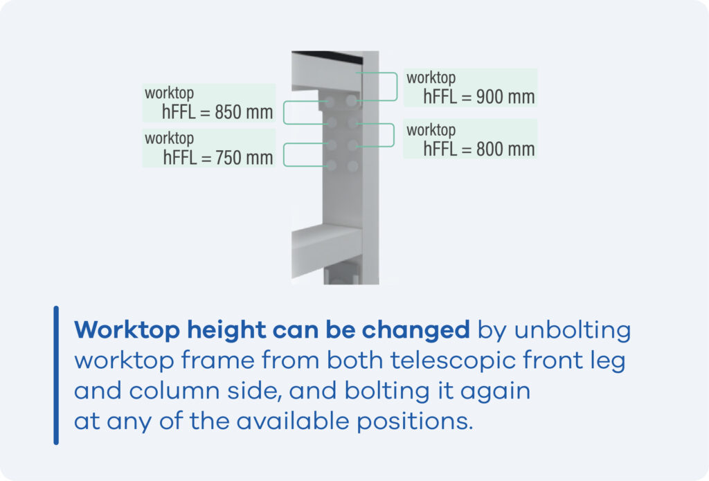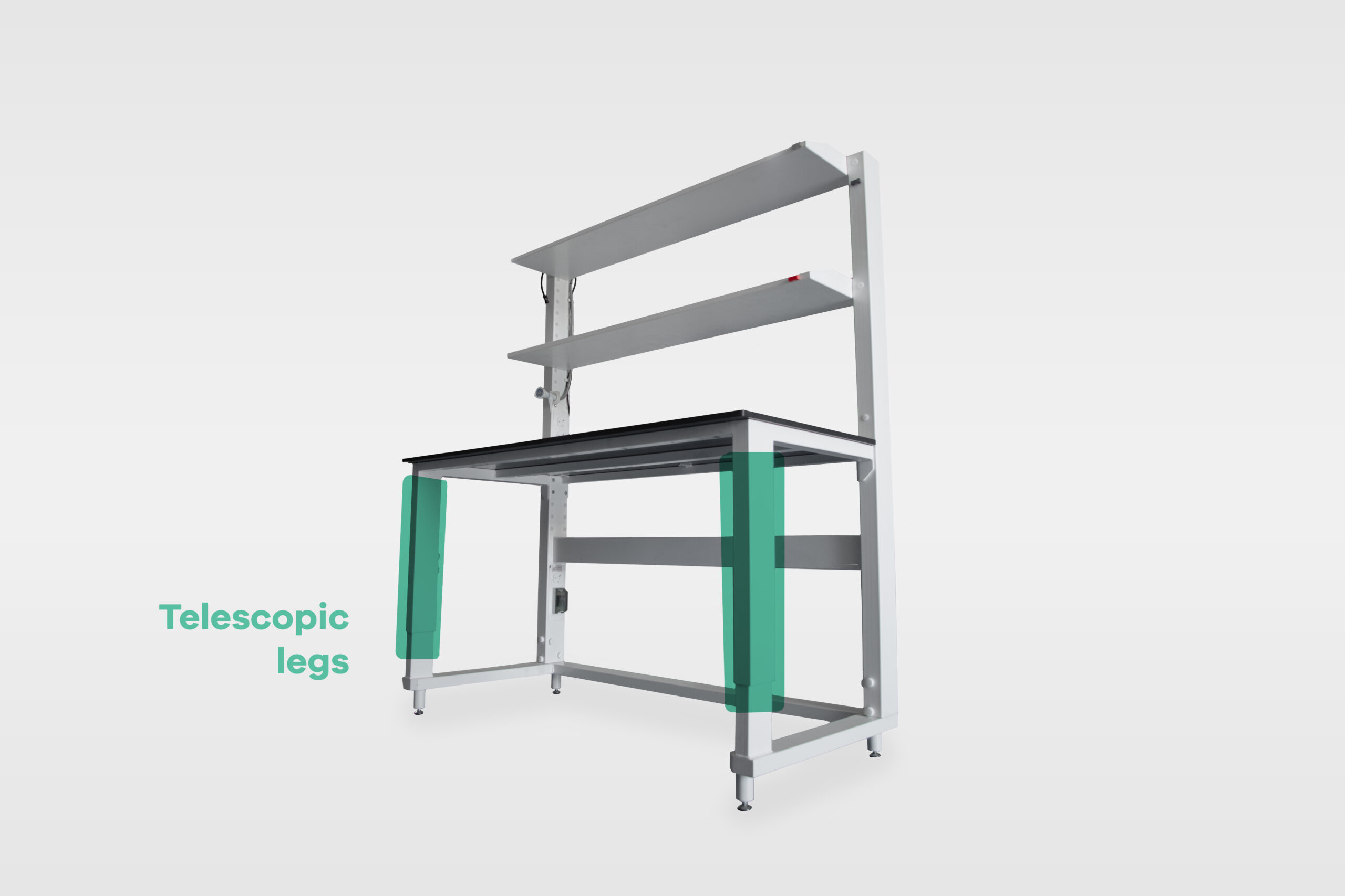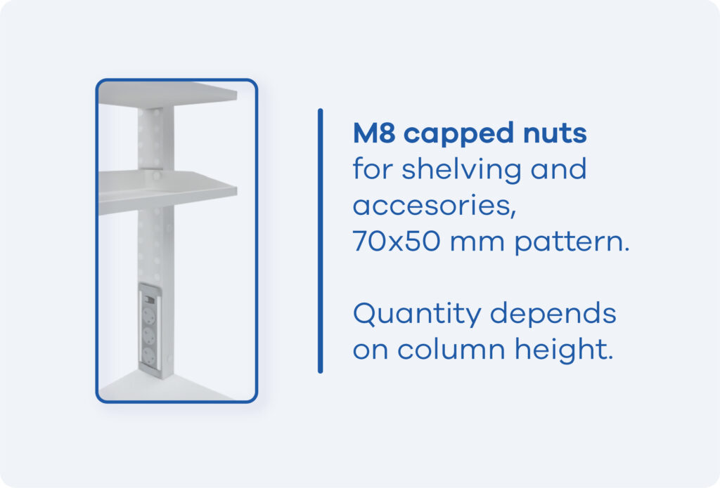 • Worktop frame fully welded steel, to be bolted to base frame and columns at any of the selectable heights. Provided M5 nuts below worktop for accesories and attachments.