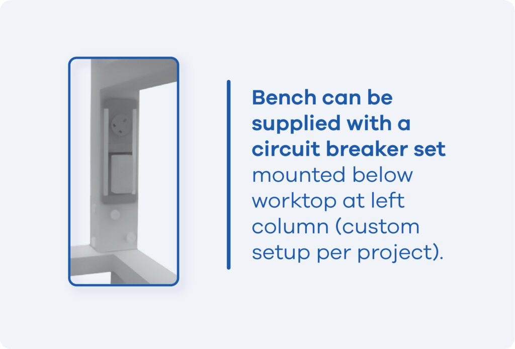 • Electrical setup 8 power sockets installed (3 each side above worktop, 1 each side below worktop). Circuit breaker setup on demand.