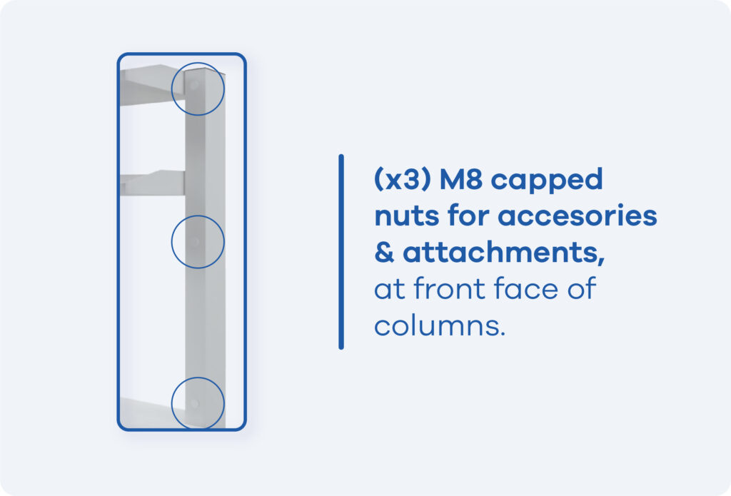 • Columns manufactured in steel tube bolted to main frame, epoxy coated 9010 (check other options), with M8 nuts at internal faces for accesories. Nuts in front faces as an option.